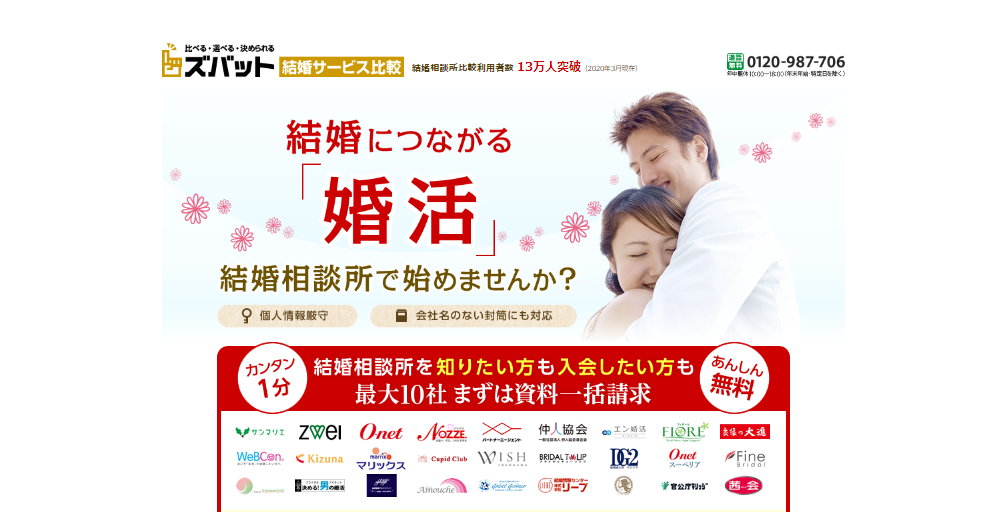 年齢・地域から大手十数社(オーネット、ツヴァイ、パートナーエージェントなど)を比較し、あなたに合った結婚相談所の料金やサービス内容を資料で一括比較できる、現在、非常に人気のあるサービスです。